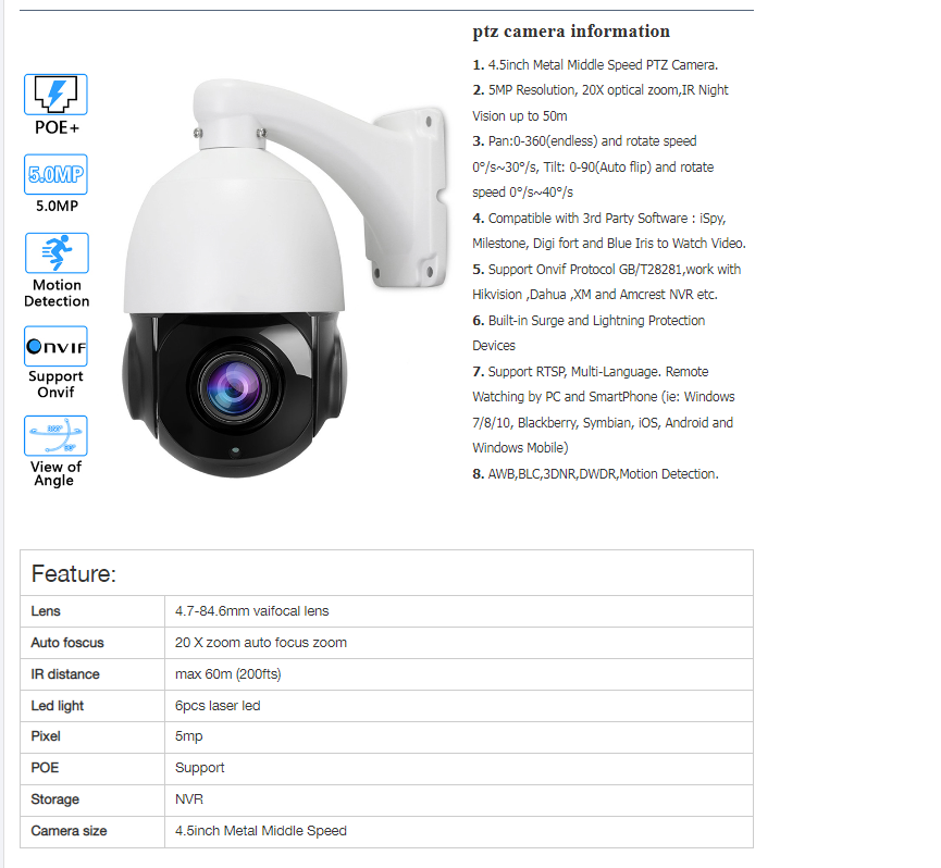 4.5inch middle speed dome camera 5MP PTZ surveillance camera 20 x Optical Zoom work with HIKvision Duhua NVR ip camera